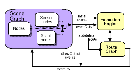 The scene graph contains nodes which describe objects and their properties. It contains hierarchically grouped geometry to provide an audio-visual representation of objects, as well as nodes that participate in the event generation and routing mechanism.